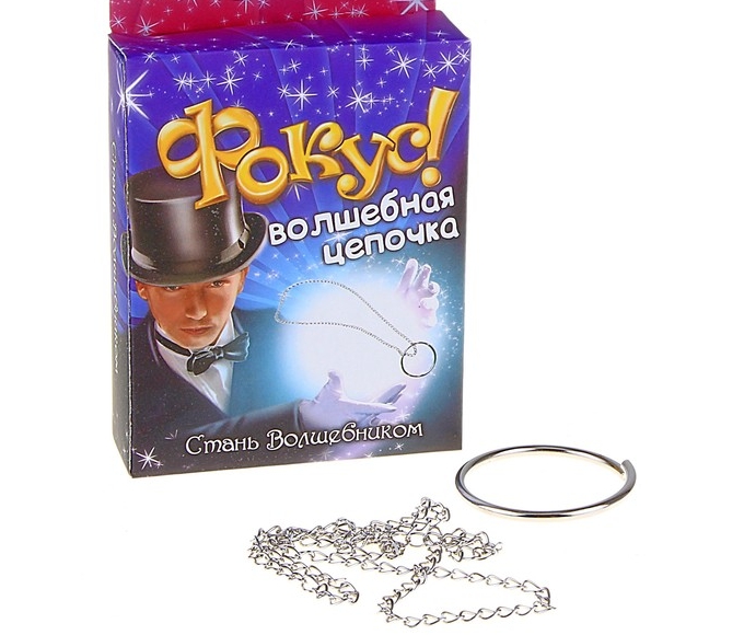 Только настоящий фокусник сможет заставить колечко самостоятельно повиснуть на цепочке! Фокусник показывает зрителям отдельно колечко и цепочку. Колечко падает – и волшебным образом оказывается подвешенным на цепочке. Для эффектного выполнения фокуса важна подготовка - обязательно тренируйтесь до выступления, чтобы выполнить фокус легко и красиво. Позаботьтесь о таинственной атмосфере – полумрак и музыка сделают шоу захватывающим. Не забывайте про заклинания и волшебную палочку! Инструкция по выполнению фокуса: 1.Держите кольцо большим и указательным пальцем, средний палец должен быть прижат к основанию большого пальца. Проденьте цепочку внутрь кольца. 2.В момент падения кольцо должно незаметно удариться о средний палец, перевернуться в воздухе. Цепочка обернется вокруг кольца и оно повиснет на цепочке.